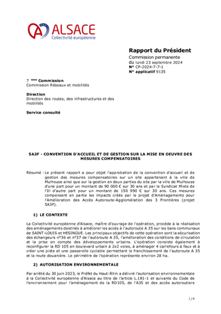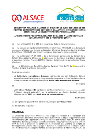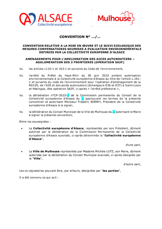 Le présent rapport a pour objet l'approbation de la convention d'accueil et de gestion des mesures compensatoires sur un site appartenant à la ville de Mulhouse ainsi que sur la gestion en deux parties du site par la ville de Mulhouse d'une part pour un montant de 90 000 € sur 30 ans et par le Syndicat Mixte de l'Ill d'autre part pour un montant de 150 990 € sur 30 ans. Ces mesures compensent en partie les impacts créés par le projet d'Aménagements pour l'Amélioration des Accès Autoroute-Agglomération des 3 Frontières (projet 5A3F).