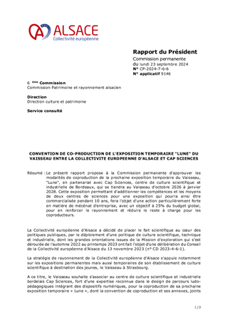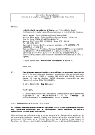 CONVENTION DE CO-PRODUCTION DE L'EXPOSITION TEMPORAIRE "LUNE" DU VAISSEAU ENTRE LA COLLECTIVITE EUROPEENNE D'ALSACE ET CAP SCIENCES