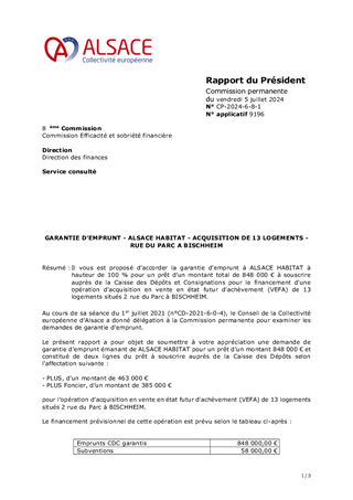 Il vous est proposé d’accorder la garantie d'emprunt à ALSACE HABITAT à hauteur de 100 % pour un prêt d’un montant total de 848 000 € à souscrire auprès de la Caisse des Dépôts et Consignations pour le financement d'une opération d’acquisition en vente en état futur d'achèvement (VEFA) de 13 logements situés 2 rue du Parc à BISCHHEIM.