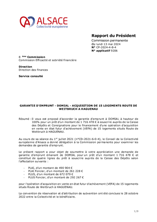 Il vous est proposé d’accorder la garantie d'emprunt à DOMIAL à hauteur de 100% pour un prêt d'un montant de 1 716 478 € à souscrire auprès de la Caisse des Dépôts et Consignations pour le financement d'une opération d’acquisition en vente en état futur d'achèvement (VEFA) de 15 logements situés Route de Weitbruch à HAGUENAU.