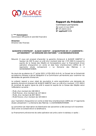 Il vous est proposé d’accorder la garantie d'emprunt à ALSACE HABITAT à hauteur de 100 % pour un prêt d’un montant total de 1 571 000 € à souscrire auprès de la Caisse des Dépôts et Consignations pour le financement d'une opération d’acquisition en vente en état futur d'achèvement (VEFA) de 17 logements situés Lotissement « Le Domaine des Matines » à SCHWINDRATZHEIM.