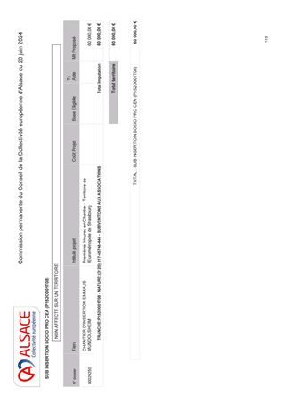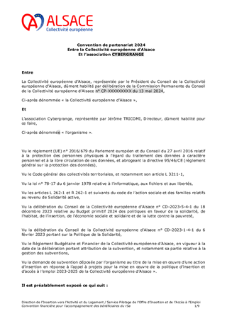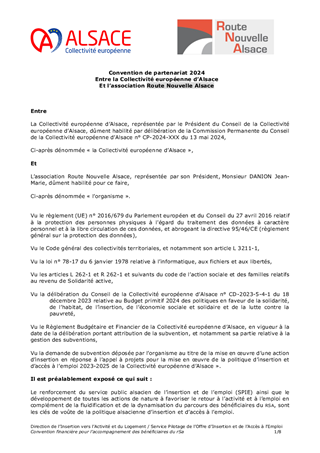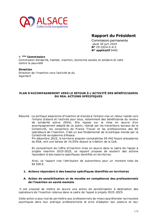 La politique alsacienne d’insertion et d’accès à l’emploi vise un retour rapide vers l’emploi d’abord et l’activité pour tous, notamment des bénéficiaires du revenu de solidarité active (RSA). Elle repose sur la mise en œuvre d’un accompagnement adapté de ce public, réalisé par les travailleurs sociaux de la Collectivité, les conseillers de France Travail et les professionnels des 80 opérateurs de l'insertion. C’est un axe fondamental de la politique menée par la Collectivité européenne d’Alsace. Fin décembre 2023, le territoire alsacien comptabilise 39 442 foyers allocataires du RSA, soit une baisse de 14,55% depuis la création de la CeA. En complément de l’offre d’insertion mise en œuvre dans le cadre de l’appel à projets insertion 2023-2025, ce rapport propose de soutenir des actions répondant à des besoins spécifiques identifiés en territoires. Ainsi, ce rapport vise l’attribution de subventions pour un montant total de 84 500 €.