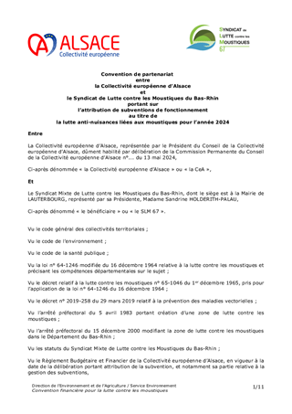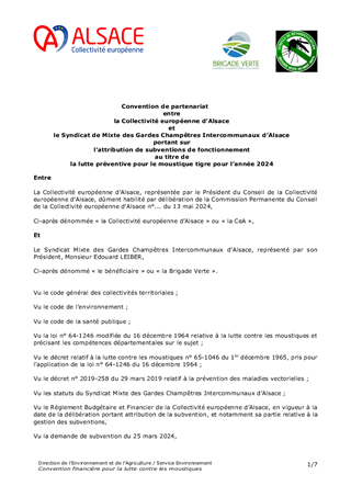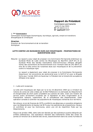 Le rapport a pour objet de proposer à la Commission Permanente d'attribuer au Syndicat Mixte de Lutte contre les Moustiques du Bas-Rhin (SLM 67) et au Syndicat Mixte des Gardes Champêtres Intercommunaux d'Alsace (Brigade Verte) des subventions de fonctionnement d'un montant total de 242 000 € au titre de la lutte contre les nuisances dues aux moustiques et de la prévention contre le moustique tigre. Le rapport a également pour objet de proposer à la Commission Permanente d'approuver les conventions de partenariat avec le SLM 67 et avec la Brigade Verte pour l'année 2024 et d'autoriser le Président de la Collectivité européenne d'Alsace à les signer.