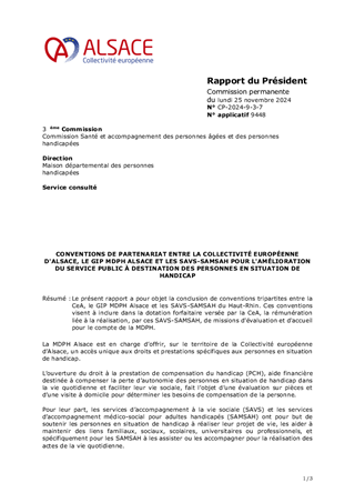 Le présent rapport a pour objet la conclusion de conventions tripartites entre la CeA, le GIP MDPH Alsace et les SAVS-SAMSAH du Haut-Rhin. Ces conventions visent à inclure dans la dotation forfaitaire versée par la CeA, la rémunération liée à la réalisation, par ces SAVS-SAMSAH, de missions d'évaluation et d'accueil pour le compte de la MDPH.
