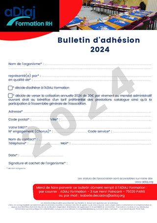 Le présent rapport propose d’approuver l’adhésion de la Collectivité européenne d’Alsace à l’association « ADIAJ Formation », organisme de formation spécialisée en ressources humaines. Cette adhésion permettra notamment à la Collectivité européenne d’Alsace de bénéficier de l’offre de formation de cette association à des tarifs préférentiels, au bénéfice de l’ensemble de ses agents.