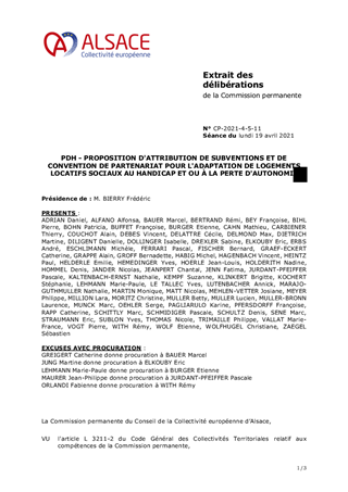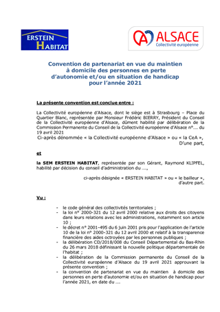 I. Le présent rapport a pour objet de proposer à la Commission permanente de décider de l’attribution de subventions suite aux demandes d’aides financières présentées par : - Office Public de l’Habitat de l’Eurométropole de Strasbourg (OPHEA) pour l’adaptation de 51 logements, tous situés sur le territoire de l’Eurométropole de Strasbourg (EMS); - Habitat de l’Ill pour l’adaptation de 10 logements, 3 situés hors EMS ; sur ces 10 logements, 3 entrent dans le cadre du Nouveau programme du renouvellement urbain (NPNRU), - Domial ESH pour l’adaptation de 10 logements, dont 7 sont situés hors EMS. II. Il est également proposé à la Commission permanente d'approuver les termes du projet de convention entre la Collectivité européenne d’Alsace et la SEM ERSTEIN HABITAT pour le maintien à domicile des personnes âgées ou en situation de handicap. Cette convention est établie pour une durée de 1 an, du 1er janvier au 31 décembre 2021.
