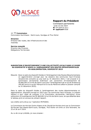 Dans le cadre du dispositif d'aides à l'Aménagement des Routes Départementales en agglomération prorogé pour les dossiers des communes haut-rhinoises réceptionnés complets au plus tard au 31 décembre 2023, il est proposé à la Commission permanente d'attribuer une subvention d'investissement de 55 860,00 € à la Ville de Saint-Louis pour l’aménagement de la rue de Strasbourg (RD 66) entre la rue de l’Aéroport et la rue du Maréchal Lefèbvre (dossier complet au 31 décembre 2023).