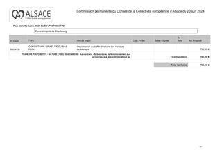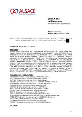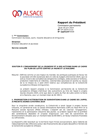Définies comme un axe majeur du mandat, les politiques publiques en faveur de la jeunesse ont été soutenues dans le vote du budget prévisionnel 2024, que ce soit au travers des compétences obligatoires (collèges, aides sociales à l’enfance, protection maternelle et infantile), volontaristes (jeunesse et sports) ou issues de la loi Alsace du 2 août 2019 relative aux compétences de la Collectivité européenne d’Alsace (bilinguisme). Le présent rapport propose à la Commission permanente de la Collectivité européenne d’Alsace d'attribuer des subventions au titre de l’appel à projets Jeunes citoyens 2024, ainsi que dans le cadre du Plan de Lutte contre la Haine et le Racisme, pour un montant total de 82 450 €.
