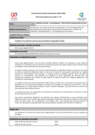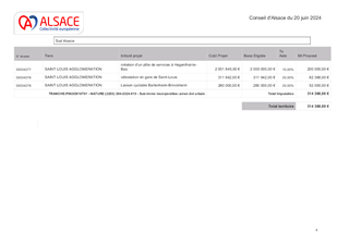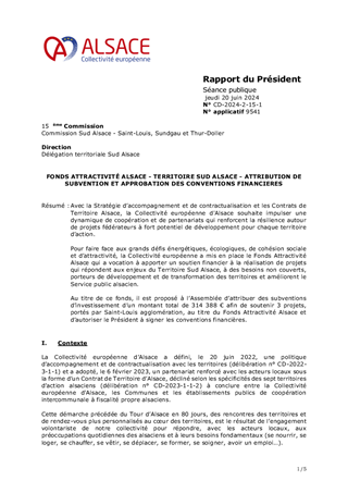 Avec la Stratégie d’accompagnement et de contractualisation et les Contrats de Territoire Alsace, la Collectivité européenne d'Alsace souhaite impulser une dynamique de coopération et de partenariats qui renforcent la résilience autour de projets fédérateurs à fort potentiel de développement pour chaque territoire d’action. Pour faire face aux grands défis énergétiques, écologiques, de cohésion sociale et d’attractivité, la Collectivité européenne a mis en place le Fonds Attractivité Alsace qui a vocation à apporter un soutien financier à la réalisation de projets qui répondent aux enjeux du Territoire Sud Alsace, à des besoins non couverts, porteurs de développement et de transformation des territoires et améliorent le Service public alsacien. Au titre de ce fonds, il est proposé à l’Assemblée d’attribuer des subventions d’investissement d’un montant total de 314 388 € afin de soutenir 3 projets, portés par Saint-Louis agglomération, au titre du Fonds Attractivité Alsace et d’autoriser le Président à signer les conventions financières.