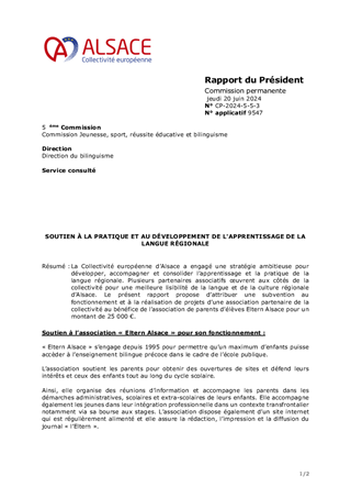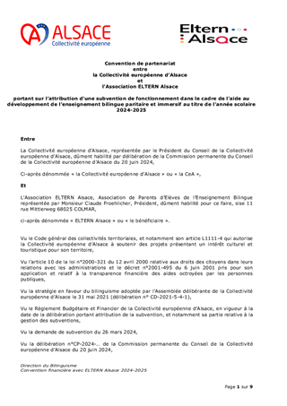 La Collectivité européenne d’Alsace a engagé une stratégie ambitieuse pour développer, accompagner et consolider l’apprentissage et la pratique de la langue régionale. Plusieurs partenaires associatifs œuvrent aux côtés de la collectivité pour une meilleure lisibilité de la langue et de la culture régionale d’Alsace. Le présent rapport propose d’attribuer une subvention au fonctionnement et à la réalisation de projets d’une association partenaire de la collectivité au bénéfice de l’association de parents d’élèves Eltern Alsace pour un montant de 25 000 €.