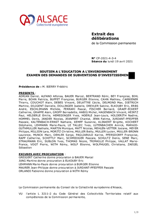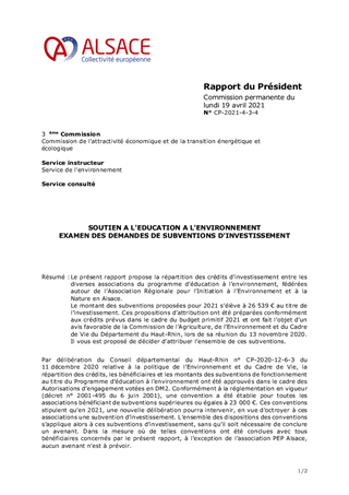 Le présent rapport propose la répartition des crédits d’investissement entre les diverses associations du programme d’éducation à l’environnement, fédérées autour de l’Association Régionale pour l’Initiation à l’Environnement et à la Nature en Alsace. Le montant des subventions proposées pour 2021 s’élève à 26 539 € au titre de l’investissement. Ces propositions d’attribution ont été préparées conformément aux crédits prévus dans le cadre du budget primitif 2021 et ont fait l’objet d’un avis favorable de la Commission de l’Agriculture, de l’Environnement et du Cadre de Vie du Département du Haut-Rhin, lors de sa réunion du 13 novembre 2020. Il vous est proposé de décider d'attribuer l’ensemble de ces subventions.