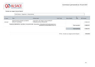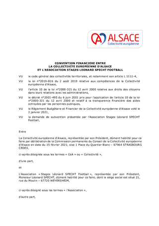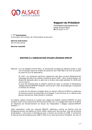 Lors du Budget Primitif 2021, la Collectivité européenne d’Alsace (CeA) a voté une enveloppe totale de crédits de paiement de 4 663 600 € au titre du soutien au sport et à la vie associative. En 2021, les politiques sportives respectives des deux anciens Départements s’appliqueront dans les mêmes conditions qu’en 2020 : dans le Nord Alsace, les dispositifs déployés dans le cadre de la révision des aides adoptée fin 2018 sont mis en œuvre. Il vous est proposé dans le présent rapport de voter un soutien à l’Association "Stages Léonard SPECHT Football" prévu au B.P. 2021 et de déployer le dispositif à l’échelle de l’Alsace. Le total de l'enveloppe à engager dans ce rapport s'élève à 8 500 € en dépenses de fonctionnement correspondant à 25 stages, 2 par territoire et 11 offerts à des jeunes relevant de l’Aide sociale à l’enfance.