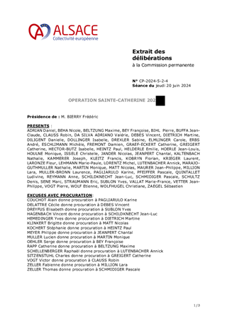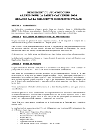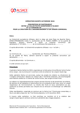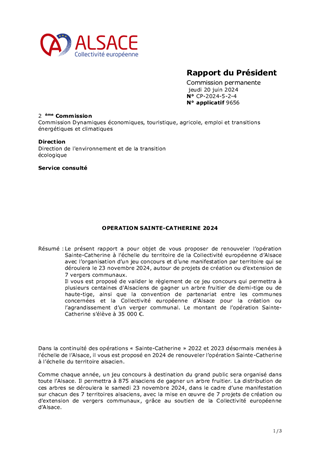 Le présent rapport a pour objet de vous proposer de renouveler l’opération Sainte-Catherine à l’échelle du territoire de la Collectivité européenne d’Alsace avec l’organisation d’un jeu concours et d’une manifestation par territoire qui se déroulera le 23 novembre 2024, autour de projets de création ou d’extension de 7 vergers communaux. Il vous est proposé de valider le règlement de ce jeu concours qui permettra à plusieurs centaines d'Alsaciens de gagner un arbre fruitier de demi-tige ou de haute-tige, ainsi que la convention de partenariat entre les communes concernées et la Collectivité européenne d’Alsace pour la création ou l’agrandissement d’un verger communal. Le montant de l’opération Sainte-Catherine s’élève à 35 000 €.