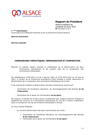 Le présent rapport propose la modification de la dénomination de deux commissions thématiques et de prendre acte de la composition des commissions thématiques.
