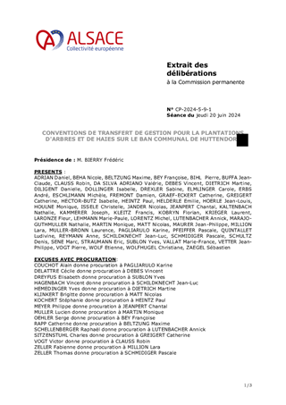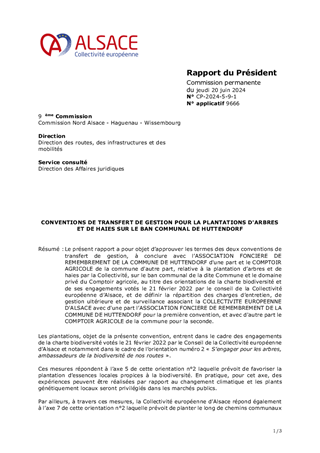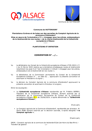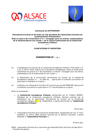 Le présent rapport a pour objet d’approuver les termes des deux conventions de transfert de gestion, à conclure avec l’ASSOCIATION FONCIERE DE REMEMBREMENT DE LA COMMUNE DE HUTTENDORF d'une part et le COMPTOIR AGRICOLE de la commune d'autre part, relative à la plantation d’arbres et de haies par la Collectivité, sur le ban communal de la dite Commune et le domaine privé du Comptoir agricole, au titre des orientations de la charte biodiversité et de ses engagements votés le 21 février 2022 par le conseil de la Collectivité européenne d’Alsace, et de définir la répartition des charges d’entretien, de gestion ultérieure et de surveillance associant la COLLECTIVITE EUROPEENNE D'ALSACE avec d'une part l’ASSOCIATION FONCIERE DE REMEMBREMENT DE LA COMMUNE DE HUTTENDORF pour la première convention, et avec d'autre part le COMPTOIR AGRICOLE de la commune pour la seconde.