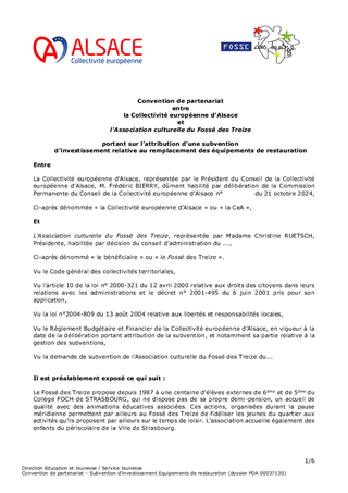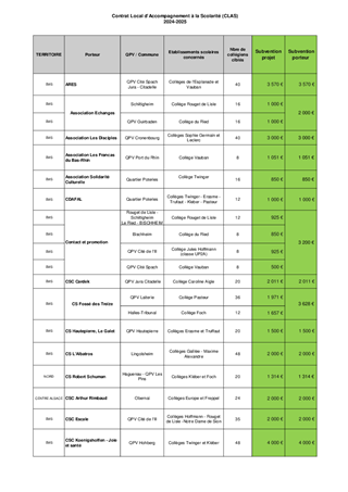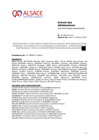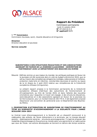 Définies comme un axe majeur du mandat, les politiques publiques en faveur de la jeunesse ont été soutenues dans le vote du budget prévisionnel 2024, que ce soit au travers des compétences obligatoires (collèges, aides sociales à l’enfance, protection maternelle et infantile), volontaristes (jeunesse et sports) ou issues de la loi Alsace du 2 août 2019 relative aux compétences de la Collectivité européenne d’Alsace (bilinguisme). Le présent rapport propose à la Commission permanente de la Collectivité européenne d’Alsace d’attribuer des subventions de fonctionnement et d’investissement, au titre de l'année 2024, et dans l’attente des nouvelles orientations pour lesquelles le travail est engagé, à des structures éducatives, socio-éducatives et à des associations agissant en faveur de la jeunesse du territoire alsacien, pour un montant total de 182 772 €. Il est également proposé d’approuver une convention de partenariat avec le Département des Bouches-du-Rhône.