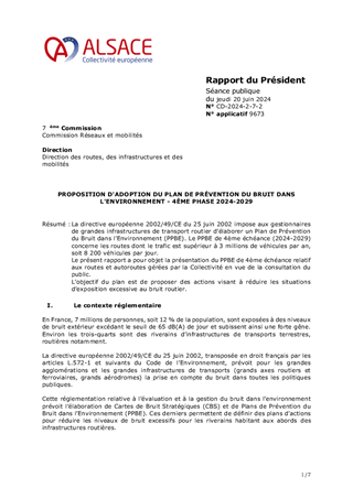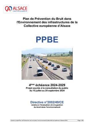 La directive européenne 2002/49/CE du 25 juin 2002 impose aux gestionnaires de grandes infrastructures de transport routier d'élaborer un Plan de Prévention du Bruit dans l’Environnement (PPBE). Le PPBE de 4ème échéance (2024-2029) concerne les routes dont le trafic est supérieur à 3 millions de véhicules par an, soit 8 200 véhicules par jour. Le présent rapport a pour objet la présentation du PPBE de 4ème échéance relatif aux routes et autoroutes gérées par la Collectivité en vue de la consultation du public. L’objectif du plan est de proposer des actions visant à réduire les situations d’exposition excessive au bruit routier.
