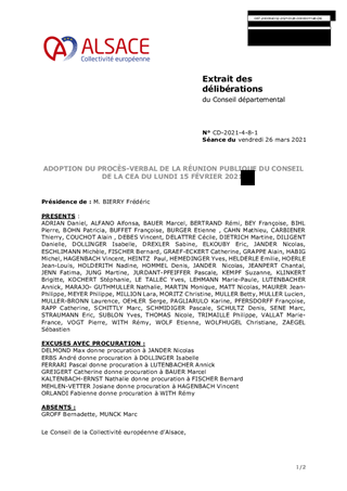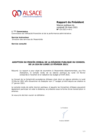Le rapport a pour objet de soumettre à l'Assemblée départementale, aux fins d'adoption, le compte rendu de sa séance publique du lundi 15 février consacrée à l'examen et à l'adoption du budget primitif 2021.