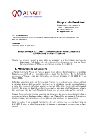 Le présent rapport a pour objet de proposer à la Commission permanente d'approuver l'attribution de subventions d'investissement au titre du Fonds Communal Alsace (FCA) pour un montant total de 4 403 283 €.