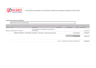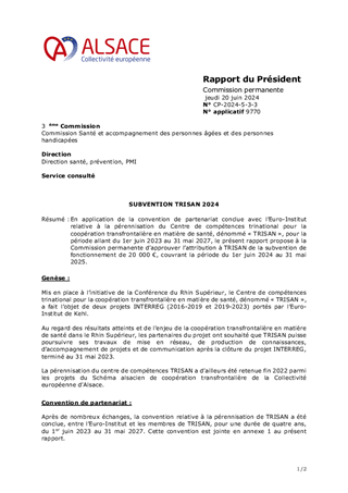 En application de la convention de partenariat conclue avec l’Euro-Institut relative à la pérennisation du Centre de compétences trinational pour la coopération transfrontalière en matière de santé, dénommé « TRISAN », pour la période allant du 1er juin 2023 au 31 mai 2027, le présent rapport propose à la Commission permanente d’approuver l’attribution à TRISAN de la subvention de fonctionnement de 20 000 €, couvrant la période du 1er juin 2024 au 31 mai 2025.