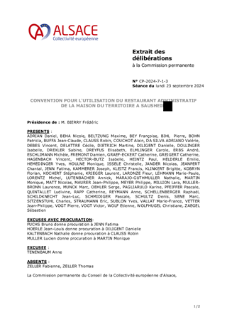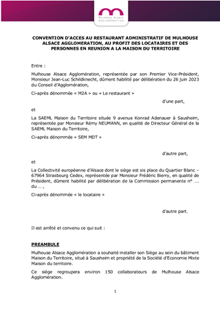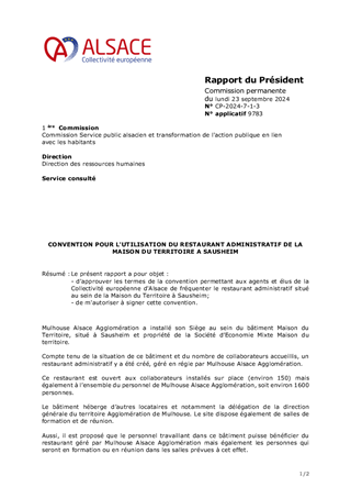 Le présent rapport a pour objet : - d'approuver les termes de la convention permettant aux agents et élus de la Collectivité européenne d'Alsace de fréquenter le restaurant administratif situé au sein de la Maison du Territoire à Sausheim; - de m'autoriser à signer cette convention.