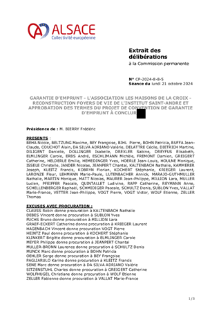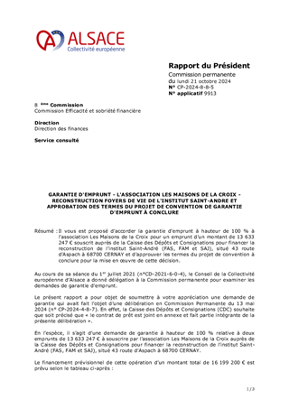 Il vous est proposé d’accorder la garantie d'emprunt à hauteur de 100 % à l’association Les Maisons de la Croix pour un emprunt d’un montant de 13 633 247 € souscrit auprès de la Caisse des Dépôts et Consignations pour financer la reconstruction de l’institut Saint-André (FAS, FAM et SAJ), situé 43 route d’Aspach à 68700 CERNAY et d’approuver les termes du projet de convention à conclure pour la mise en œuvre de cette décision.