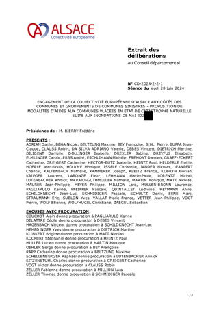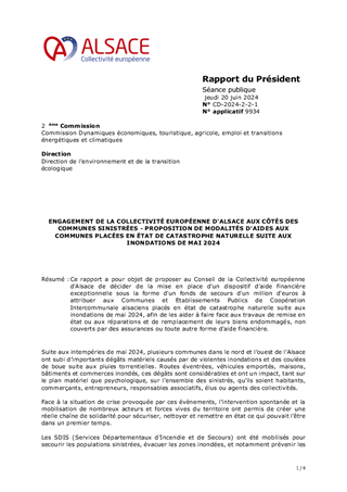 ENGAGEMENT DE LA COLLECTIVITÉ EUROPÉENNE D'ALSACE AUX CÔTÉS DES COMMUNES ET GROUPEMENTS DE COMMUNES SINISTRÉS - PROPOSITION DE MODALITÉS D'AIDES AUX COMMUNES PLACÉES EN ÉTAT DE CATASTROPHE NATURELLE SUITE AUX INONDATIONS DE MAI 2024