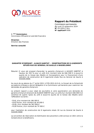 Il vous est proposé d’accorder la garantie d'emprunt à ALSACE HABITAT à hauteur de 100 % pour un prêt d’un montant total de 666 000 € à souscrire auprès de la Caisse des Dépôts et Consignations pour le financement d'une opération de construction de 8 logements situés Rue du General de Gaulle à WASSELONNE.