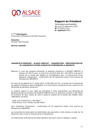 Il vous est proposé d’accorder la garantie d'emprunt à ALSACE HABITAT à hauteur de 100 % pour un prêt d’un montant total de 2 181 500 € à souscrire auprès de la Caisse des Dépôts et Consignations pour le financement d'une opération d’acquisition - amélioration de 25 logements situés 141A avenue de Strasbourg à BRUMATH.