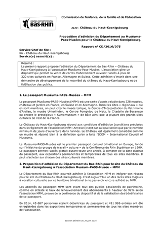 Le présent rapport propose l’adhésion du Département du Bas-Rhin – Château du Haut-Kœnigsbourg à l’association Muséums-Pass-Musées. L’association gère un dispositif qui permet la vente de cartes d’abonnement ouvrant l’accès à plus de 320 sites culturels en France, Allemagne et Suisse. Cette adhésion s’inscrit dans une démarche de développement de la notoriété du château du Haut-Kœnigsbourg et de fidélisation des publics.