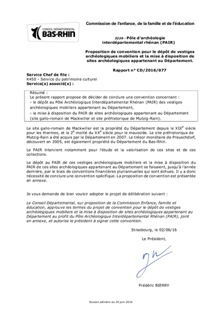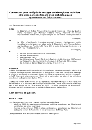 Le présent rapport propose de décider de conclure une convention concernant : - le dépôt au Pôle Archéologique Interdépartemental Rhénan (PAIR) des vestiges archéologiques mobiliers appartenant au Département, - la mise à disposition du PAIR de sites archéologiques appartenant au Département (site gallo-romain de Mackwiller et site préhistorique de Mutzig-Rain).
