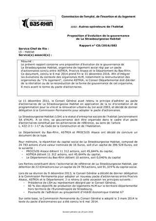 Le présent rapport concerne une proposition d'évolution de la gouvernance de La Strasbourgeoise Habitat, organisme de logement social régi par un pacte d'actionnaires conclu entre ASTRIA, Procivis Alsace et le Département du Bas-Rhin. Ce document, conclu le 6 mai 2014 prend fin le 31 décembre 2016. Afin d'intégrer les évolutions du contexte des organismes HLM, notamment la restructuration des organismes du "1% logement", comme ASTRIA, le Conseil Départemental doit décider de la résiliation ou de la reconduction de la forme de gouvernance de cet organisme, 6 mois avant le terme du pacte d'actionnaires.