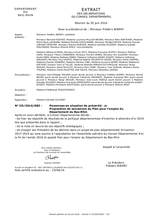 Le Département du Bas-Rhin s’est engagé dans une stratégie ambitieuse et atypique au niveau national pour permettre l’insertion des allocataires du RSA. Grâce à des dispositifs d’insertion profondément orientés vers l’accès à l’emploi et à la juste attribution des droits, le nombre des allocataires du RSA ralentit, voire tend à se réduire. Sur les douze derniers mois, alors que le chômage a augmenté de 1,5%, le nombre d'allocataires du RSA a diminué de 2,9%. 3000 d'entre eux ont retrouvé un emploi grâce à 631 entreprises et 439 collectivités et associations qui les ont recrutés. Les dépenses ont ainsi été réduites de 7 M€. L’objet du présent rapport est de proposer à l'Assemblée plénière de décider des objectifs stratégiques renforcés pour la politique d’insertion pour les années 2017 à 2019. Ils devront être déclinés et formalisés dans un plan départemental d’insertion à soumettre à l’Assemblée plénière du Conseil Départemental d’ici la fin de l’année 2016. Le nouveau plan d'insertion sera le Plan pour l'emploi du Département du Bas-Rhin.