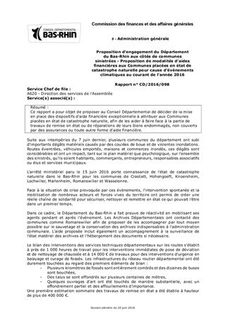 Proposition d'engagement du Département du Bas-Rhin aux côtés de communes sinistrées - Proposition de modalités d’aides financières aux Communes placées en état de catastrophe naturelle pour cause d’évènements climatiques au courant de l’année 2016
