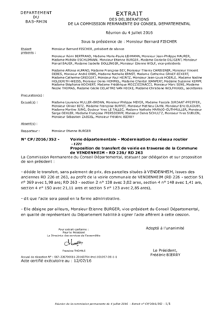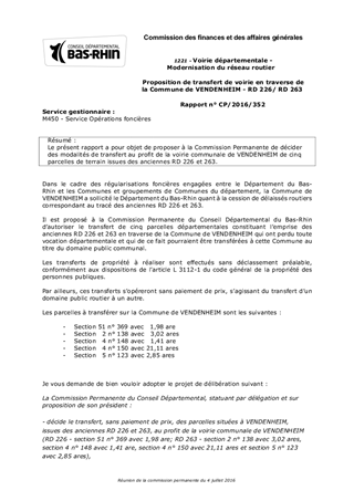 Le présent rapport a pour objet de proposer à la Commission Permanente de décider des modalités de transfert au profit de la voirie communale de VENDENHEIM de cinq parcelles de terrain issues des anciennes RD 226 et 263.