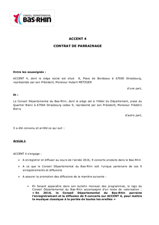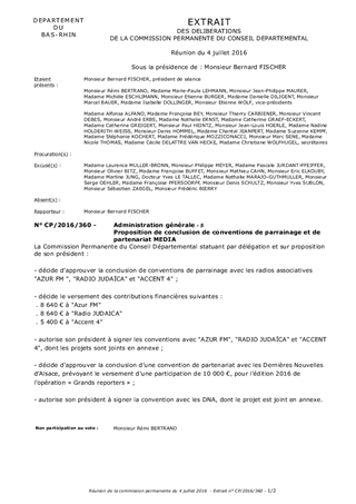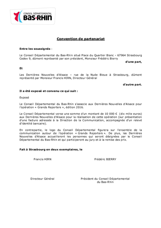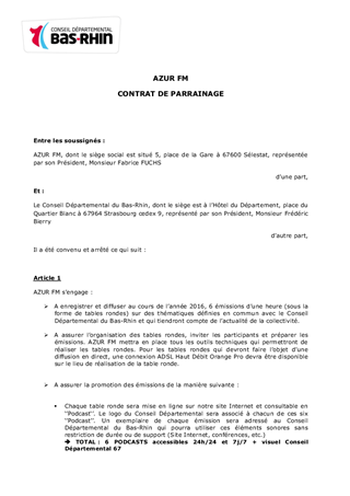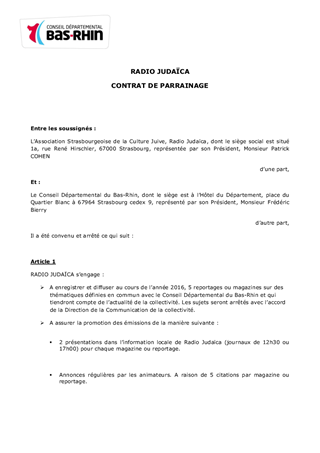 Le présent rapport a pour objet de proposer à la Commission Permanente de décider de conclure d’une part, des conventions de parrainage entre le Département et les radios « AZUR FM », « RADIO JUDAICA » et « ACCENT 4 », en vue de la réalisation et la diffusion d’émissions ou de programmes radiophoniques dans le cadre d’un partenariat établi depuis plusieurs années avec ces médias, et, d’autre part, de décider de conclure une convention de partenariat relative à l’opération « Grands reporters » ouverte à l’ensemble des collèges alsaciens en 2016, sur le thème : « Les adolescents : quel engagement citoyen ? », avec les Dernières Nouvelles d’Alsace.