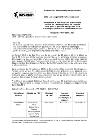 Le présent rapport vise à proposer à la Commission Permanente de décider d'attribuer des subventions d'investissement pour la prise en charge des frais d’échanges amiables d'immeubles ruraux (articles L. 124-1 à L. 124-4-1 du code rural et de la pêche maritime), aux organismes figurant sur la liste annexée.
