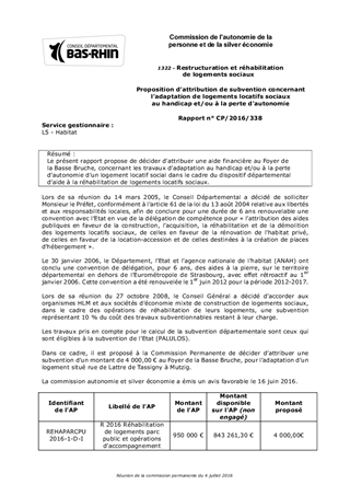 Le présent rapport propose de décider d'attribuer une aide financière au Foyer de la Basse Bruche, concernant les travaux d’adaptation au handicap et/ou à la perte d’autonomie d’un logement locatif social dans le cadre du dispositif départemental d’aide à la réhabilitation de logements locatifs sociaux.