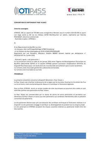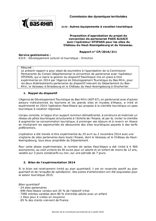 Le présent rapport a pour objet de soumettre à l'approbation de la Commission Permanente du Conseil Départemental la convention de partenariat avec l'opérateur OTIPASS, qui a repris la gestion du dispositif Pass'Alsace mis en place à titre expérimental en 2014 par l'Agence de Développement Touristique du Bas-Rhin, pour les deux établissements partenaires du dispositif relevant du Département du Bas-Rhin, le Vaisseau à Strasbourg et le Château du Haut-Koenigsbourg à Orschwiller.