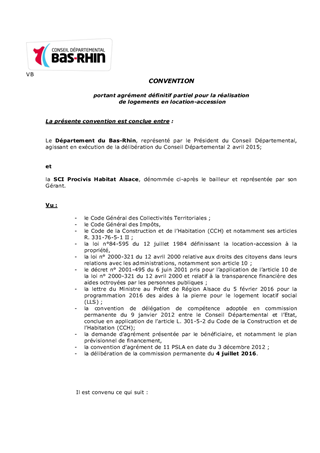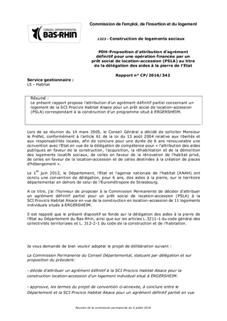 Le présent rapport propose l’attribution d’un agrément définitif partiel concernant un logement de la SCI Procivis Habitat Alsace pour un prêt social de location-accession (PSLA) correspondant à la construction d’un programme situé à ERGERSHEIM.