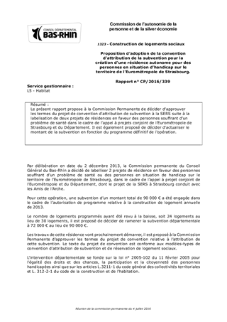 Le présent rapport propose à la Commission Permanente de décider d'approuver les termes du projet de convention d'attribution de subvention à la SERS suite à la labelisation de deux projets de résidences en faveur des personnes souffrant d’un problème de santé dans le cadre de l’appel à projets conjoint de l’Eurométropole de Strasbourg et du Département. Il est également proposé de décider d'actualiser le montant de la subvention en fonction du programme définitif de l'opération.