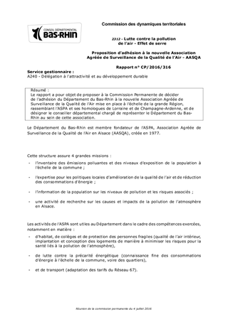 Le rapport a pour objet de proposer à la Commission Permanente de décider de l'adhésion du Département du Bas-Rhin à la nouvelle Association Agréée de Surveillance de la Qualité de l’Air mise en place à l’échelle de la grande Région, rassemblant l’ASPA et ses homologues de Lorraine et de Champagne-Ardenne, et de désigner le conseiller départemental chargé de représenter le Département du Bas-Rhin au sein de cette association.