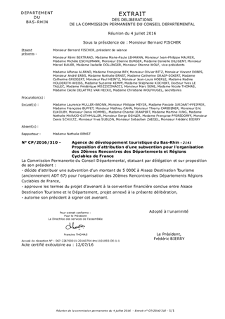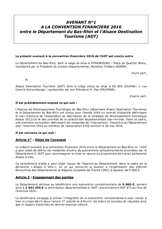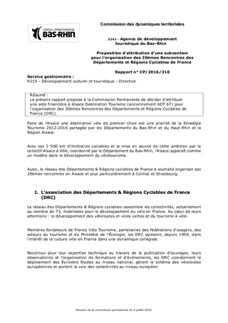 Le présent rapport propose à la Commission Permanente de décider d'attribuer une aide financière à Alsace Destination Tourisme (anciennement ADT 67) pour l'organisation des 20èmes Rencontres des Départements et Régions Cyclables de France (DRC).