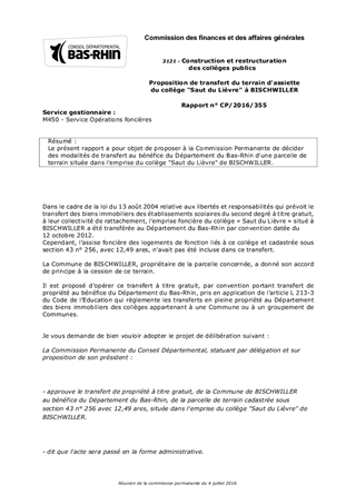 Le présent rapport a pour objet de proposer à la Commission Permanente de décider des modalités de transfert au bénéfice du Département du Bas-Rhin d'une parcelle de terrain située dans l'emprise du collège "Saut du Lièvre" de BISCHWILLER.
