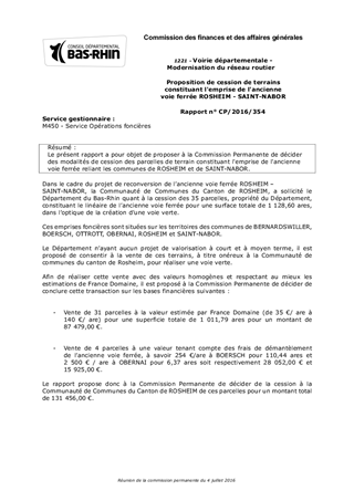 Le présent rapport a pour objet de proposer à la Commission Permanente de décider des modalités de cession des parcelles de terrain constituant l'emprise de l'ancienne voie ferrée reliant les communes de ROSHEIM et de SAINT-NABOR.