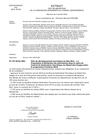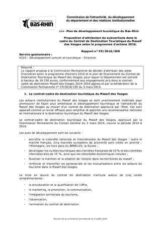 Le rapport propose à la Commission Permanente de décider d'attribuer des aides financières selon le programme d'actions 2016 et le plan de financement du Contrat de Destination Touristique du Massif des Vosges, pour lequel le Département est sollicité à hauteur de 18 250 euros, conformément aux engagements pris dans le contrat-cadre de destination Massif des Vosges 2014-2018 approuvé par la délibération de la Commission Permanente n° CP/2014/155 du 3 mars 2014.