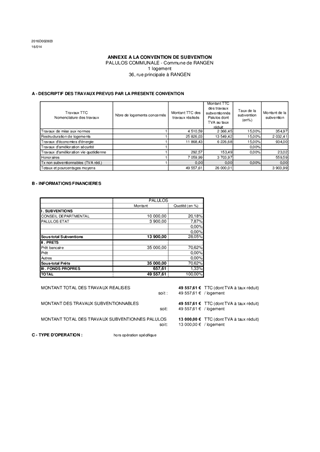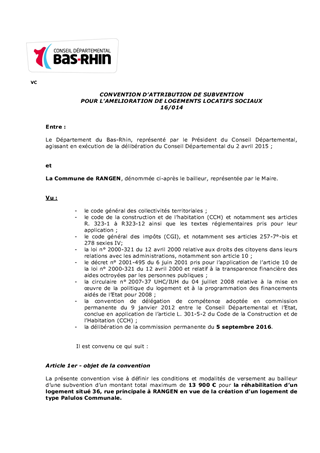 Le présent rapport a pour objet de proposer à la Commission Permanente de décider d'attribuer à la Commune de RANGEN une aide financière en vue de la création d’un logement locatif social communal situé 36, rue principale dans le cadre du dispositif de la PALULOS communale.