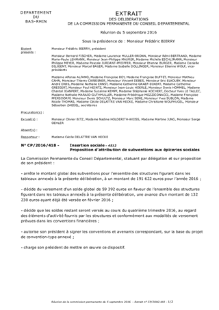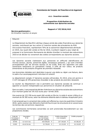 Le Département du Bas-Rhin attribue chaque année des aides financières aux épiceries sociales, contribuant par leur action à l’insertion sociale des allocataires du RSA. Une avance financière, représentant 70% de la subvention départementale attribuée en 2015, leur ayant été versée en février 2016, le présent rapport a pour objet de proposer à la Commission Permanente de décider d'arrêter le montant des subventions 2016 et de décider du versement des soldes correspondants aux épiceries sociales.