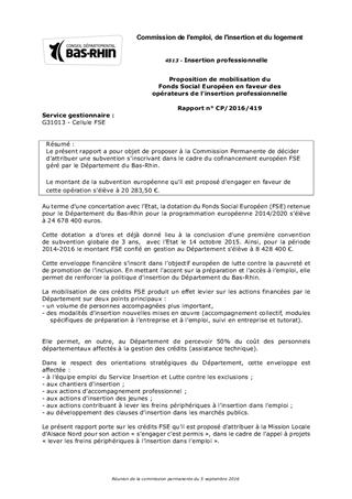 Le présent rapport a pour objet de proposer à la Commission Permanente de décider d’attribuer une subvention s’inscrivant dans le cadre du cofinancement européen FSE géré par le Département du Bas-Rhin. Le montant de la subvention européenne qu’il est proposé d'engager en faveur de cette opération s’élève à 20 283,50 €.