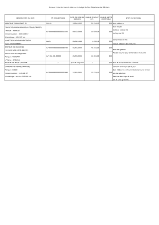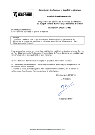 Le présent rapport a pour objet de proposer à la Commission Permanente de décider de la cession de matériels et véhicules, propriété du Département ( Parc Départemental d'Erstein).